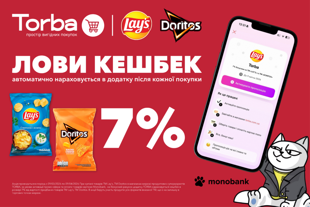 З 09.03.2026 по 09.04.2026 купуй улюблені снеки ™Lay’s та ™Doritos у супермаркетах TORBA, розраховуйся карткою Mono та отримуй 7% кешбеку на бонусний рахунок у додатку TORBA.