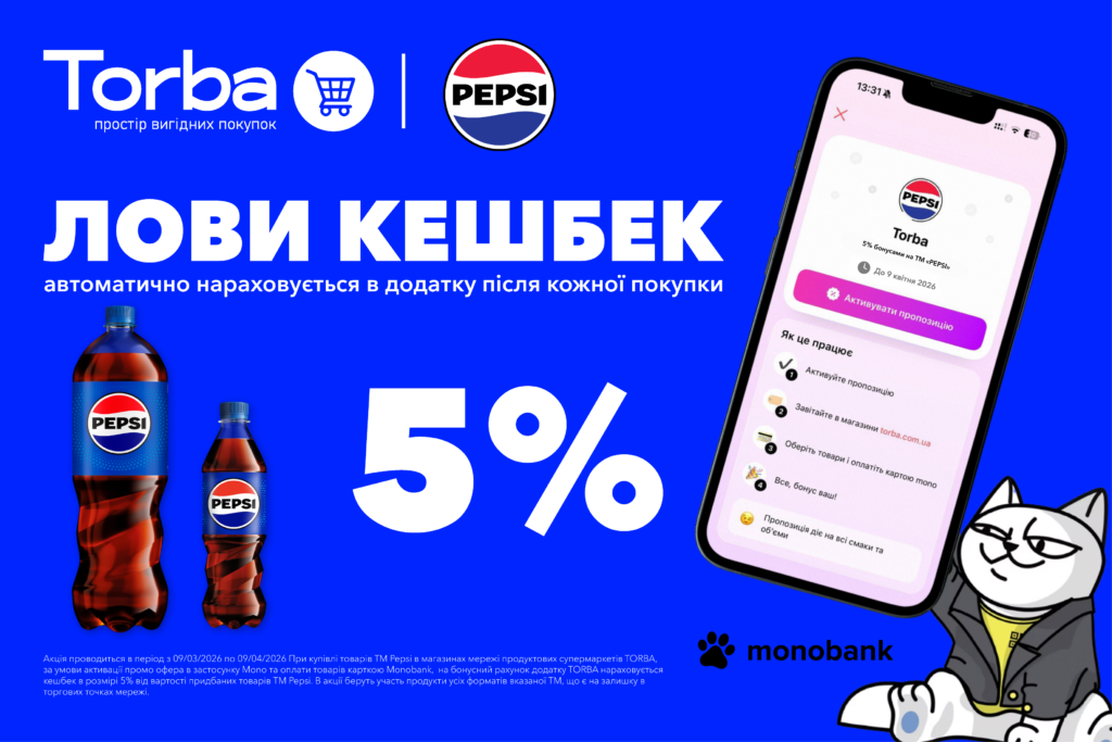 З 09.03.2026 по 09.04.2026 купуй улюблені напої ™ Pepsi у супермаркетах TORBA, розраховуйтесь карткою Mono та отримуй 5% кешбеку на бонусний рахунок у додатку TORBA.