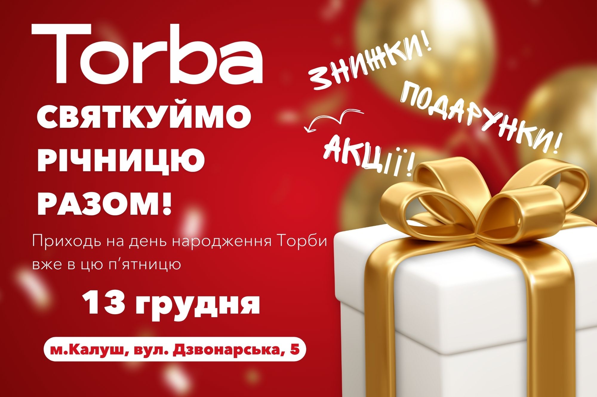 Запрошуємо вас на святкування річниці нашого магазину! м. Калуш, вул.Дзвонарська, 5Приєднуйтесь до нас і скористайтеся вигідними пропозиціями:✨ Суперзнижки на улюблені товари 🎁 ПодарункиМи підготували безліч приємних несподіванок, які зроблять ваші покупки незабутніми! Чекаємо вас на святкуванні річниці вашої Торби, адже саме ви робите наш рік особливим! 💕